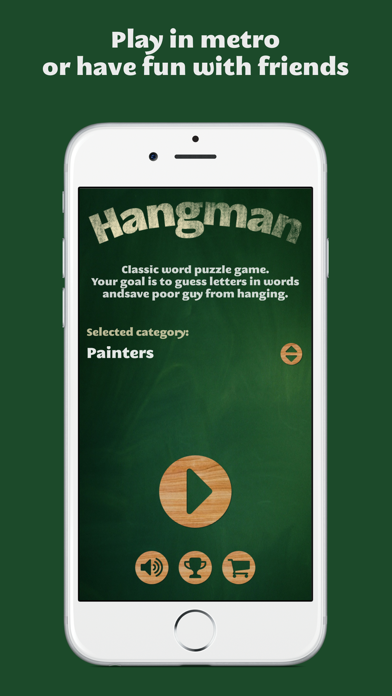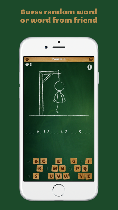 Most beautiful classic hangman puzzle game. Your goal is to guess letters to form a word and save the poor guy from hanging. Get most score and be the best in the world. Features: - 20 categories and more then 4000 words - create own word - score and world top score players - 3 lives at beginning - 1 point for each word - after each 10 points 1 extra life - word without mistake 3 points - sound effects - great graphic and lot of fun - Game Center Hints: - use the hint if you need a help - hint will show you the next letter - you have 10 hints at the beginning - you will get one hint after 10 successfully solved puzzles - buy hints if you don't want to wait Categories: Actor/Actress Animals Athletes Body Brands Capital cities Cars Countries Fruit and Vegs Football-Soccer teams Ice Hockey Players Job Titles Movies Olympic sports Painters Rivers Scientist Singers Sports US Open Winners Winners of Tour de France (Yellow jersey, Green jersey, White with red dots jersey) Writers