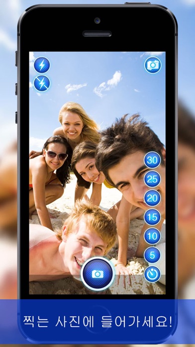 마음에 드는 사진에서 나만 빠져서 아쉬웠던 적은 없으세요? 이제 여러분도 사진에 나올 수 있습니다! 원하는 시간을 설정하고 모두 포즈를 잡도록 한 다음 친구들 사이에 들어가세요. 조명이 충분하지 않으면 플래시를 조절하고 전면 또는 후면 카메라 중에서 사용할 카메라를 선택하세요. 사진이 마음에 들지 않으세요? 문제 없습니다. 자르기 기능을 사용하면 모든 것을 올바르게 만들 수 있습니다. 마음에 드는 사진을 Facebook, Twitter, 이메일, SMS로 공유하거나 인쇄하거나 사진 앨범에 저장하시면 됩니다. 즐거운 시간 보내세요!