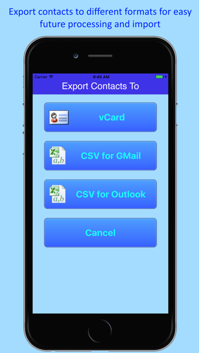 1.2.3 Contacts Backup And Merge for iPhone - easy and intuitive way to organize your contacts! Simple and intuitive interface allows to perform a wide range of contacts management actions by number of touches on your screen. Backup and Restore, Export and Import your contacts in 2 - 3 touches on your screen. The basic function of 1.2.3 Contacts Backup And Merge are export and import iPhone Contacts to vCard or CSV file formats (supports predefined formatting for Gmail and Outlook compatibility). Now it possible to backup Contacts locally with unlimited history and easily restore them with various merge/replace options. The similar functionality allow to backup contact on your favorite cloud drive. Current version supports Dropbox, SkyDrive and GDrive for cloud backup. It possible also to backup iPhone Contacts in safe place by sending it to your own e-mail address. 1.2.3 Contacts Backup And Merge provides additional ways to manage your Contacts. You can choose to synchronize your iPhone Contacts directly with your Gmail and Yahoo accounts, or export your contacts directly to Hotmail/Outlook.com address book. 1.2.3 Contacts Backup And Merge help you quickly find duplicates in Address Book with a number of search criterions. Duplicates can be merged automatically or manually with different replace / update options. Features: - Backup your iPhone/iPad Contacts in just 1-2-3 simple steps! - Restore Contacts from backup in just 1-2-3 simple steps! - Export Contacts directly to Google, Hotmail or Yahoo account - Import Contacts directly from Google or Yahoo account (import from Hotmail not supported due to Microsoft's security restriction) - Find duplicate Contacts on your device - Merge duplicate Contacts manually or automatically - Create Contact Groups - Send text messages (SMS) to all contacts in group Backup Contacts: - Backup your iPhone/iPad Contacts in vCard or various CSV formats - Backup saves Contacts locally on device, cloud drive or e-mail - Backup Contacts locally with unlimited history - Dropbox, OneDrive or Google Drive supported Restore Contacts: - Restore your iPhone/iPad Contacts from vCard or various CSV formats - Restore Contacts saved locally on device - Restore Contacts from cloud drive or e-mail - Dropbox, OneDrive or Google Drive supported - Various Smart Merge options during contacts import! Export Contacts: - Export Contacts directly to Google, Hotmail and Yahoo accounts! Import Contacts: - Import Contacts directly from Google and Yahoo accounts! Duplicate Contacts Management: - Find and Merge duplicate contacts manually or automatically! - Find and Merge contacts duplicate by phone or email Group messaging: - Create unlimited number of contact groups - Send messages (SMS) to all contacts in group at ones
