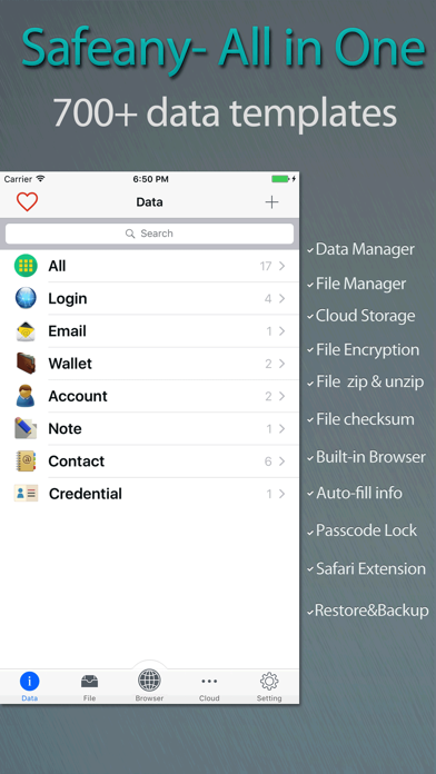 All feature in one app, Safeany = Password Manager+Contact Manager+File Manager+ Cloud storage + File Encryption+ unzip tool+ File checksum +Built-in Browser,etc. We provide the strongest security encryption protection methods that can effectively protect your personal information, privacy, account, photos . Safeany is not only an application, but also is a set of personal data protection solution. Safeany is by far the most complete information security applications, providing a one-stop service,Includes document management, image and video management, account management, contact management, cloud storage services, file compression, file encryption, text encryption and other functions. security: - Everything is protected by a Master Password that only you know - Protect your confidential information such as account numbers, usernames, passwords and more - Offer File Checksum,Support MD5,SHA1 and CRC32 - Auto-Lock protects your vault even if your device is lost or stolen Info Management: - create data with multi-templates,include web login, Email、contact,etc. - Organize your data into Folders - Support folder lock - Powerful Search to find what you need fast - import/export your contact - Backup & Restore your data - Links, phone numbers and email addresses can be activated by touch Cloud Storage Service: - support SkyDrive,Google Drive, Dropbox and box - support create new folder, upload and download files - offer progress for file downloading and uploading Documents viewer and File manager - Folder support. - Create new folders - create new text file - import photo from album - import video from Camera Roll - import music from iPod Library - record voice - Supports view PDF file, Microsoft Office documents (Word& Excel). - View image files(JPG, PNG, GIF, TIFF and others)and other plain text file. - Rename, Movie, Delete file. - Zip/UnZip/UnRAR , support major compressed file formats: RAR, ZIP,TAR,GZIP. - Compress files and Folder into ZIP file. Encryption and decryption: - support encrytption and decryption for any file,you can set your password for encryption your application - Universal app for iPhone, iPad, and iPod touch - No subscription or other recurring fees Join to Safeany today. Your life will be more convenient and safe. We are looking forward to hear from you. Get in touch with us at [email protected]. Follow Me on Twitter: https://twitter.com/yourqm Like My Facebook page: https://www.facebook.com/yourqm51