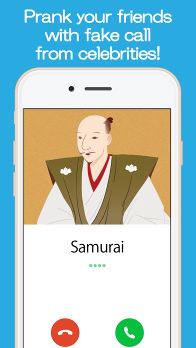 Prank your friends with fake call from celebrities! Super EASY to use. Just set a caller name and click "Start"! You can use this app in various situation! Everybody will be fooled by fake call which looks real! ■Use case 1. Drinking with boss chatting forever! --> Escape with Fake Call! "Sorry I have to go, because my wife is calling!" 2. Persistent man chasing me. Annoying!! --> Take him away with Fake Call! "I have a boyfriend who is just calling me! See ya!" 3. Wow Samurai is calling me from Japan! --> Surprise your friends! Please be noted: We never collect any user information from this app.
