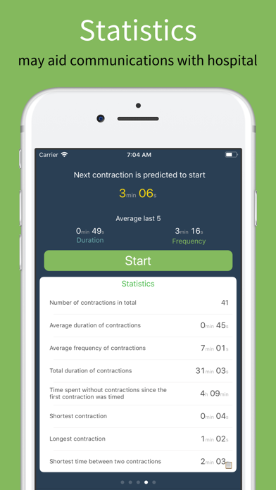 This app is designed to aid you when communicating with the hospital and your midwife. Besides being a aid, it will also generate you a memorable diary based on you contraction, notes and photos. We encourage you to take notes and photos as you will most likely want to look back to the time you now have infront of you. Features: Predicts when the next contraction will begin as well as how long it will elapse. Calculates the frequency between your contractions which gives a hint on how intense your contractions are getting. Charts give you a visual presentation of your progress and we try to indicate when you are reaching the point when you should be ready to head for the hospital. We try to make it easy for you to alter the contractions after you have timed them. From our own experience the most annoying thing while timing the contractions was that you often missed some and couldn't easily add or change them. We let you remove singel contraction so that contractions timed by mistake will not cause any annoyance We have no limit regarding how many contractions you are allowed to time. Important: Every birth is unique, so listen to your midwife regarding to when you should head for the hospital. This app is designed to be a aid for you in that communication. Chart: You can easily see in the chart when the frequency of your contractions begin to approach around 3-5min. A recommendation is to get in touch with the hospital when you start getting 3 contractions within 10min.