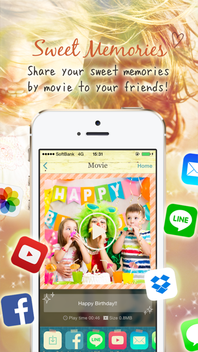 Sweet Movies is a video editing app offering a high level of functionality and which can be used easily with only one hand. This app is very easy to use. Just select multiple photos from your camera roll, verify the results using the preview functionality, and then output the final video. With these easy steps you can create your very own original movies. Sweet Movies also provides the usual standard functionality, offering the following features which allow you to add in videos, view them, and more. Right, let's turn your memories into videos!