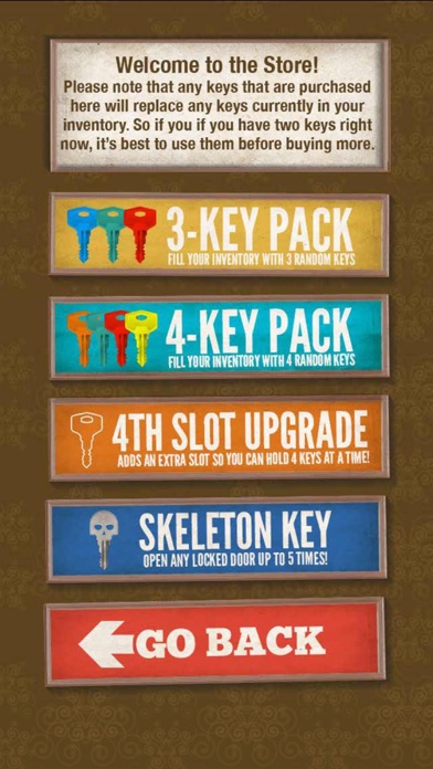 If you've ever opened a door in your life, then you're completely qualified to play this simple, frustrating, and outright addicting game! Doors: 1) You are presented with two colored doors. One is locked and the other is unlocked. 2) Tap a door to open it. If it's locked, game over. If it's unlocked, you advance to the next level! 3) Repeat. Keys: Every 5th level has two doors of the same color. Both are unlocked, but one has a colored key behind it. If you get the key, it sits in your key inventory until you tap on a locked door of that color. The key will unlock that door and disappear from you inventory. You can earn keys by sharing Doors & Keys on social media or by visiting the Doors & Keys Store. The Skeleton Key: This is a very special key that requires the 4-solt upgrade. Once you have a Skeleton Key, you can automatically unlock any locked door if you don't already have its key. The best part is, the Skeleton Key lasts for five unlocks!