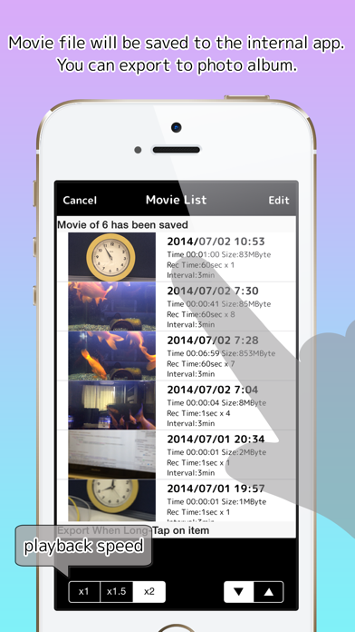 Observation Video tropical fish, pet, and sleeping posture of yourself! The operation is very easy. The recording time, can be specified at 5-sec intervals up to 1,5 to 30 secs!(*1) Recording interval, can be specified at 5-min intervals up to 3, 5 to 90 min! The recording start time, can be specify a 5-min interval to 0-2 hours later. Movie file will be saved to the internal app. You can export to photo album. Movie file playback speed x1.0 x1.5 and x2.0. Enjoy! Notes: - Please use it fixed your iPhone with a tripod. - If you want to shoot continuously for a long period, on the power connection, please use. - If you press the Home button during shooting, as far as it is the last recorded is saved. - Screen saver will work in 30 seconds after the start of recording. *1 iPhone4/4s You can record up to 15 seconds. * If the application does not start camera, please check the following. Settings -> Privacy -> Camera-> Observation is on.
