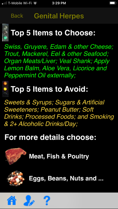 Choose This Not That for Genital Herpes. Inside this colorful app, you will find easy to follow suggestions on how to improve your health through nutrition and the food choices you make every day. This app provides comprehensive and actionable nutrition guidelines for how to combat herpes and its symptoms. Scientific research shows that there are a number of nutrients and natural food items that play a significant role in dealing with herpes. If you rather tackle health issues and risks through proper nutrition and lifestyle changes then this app is for you! A number of powerful, unique and interactive features make this app so different and superior to others in the market: • Separate guidelines for those who might be at risk with any of the following conditions along with herpes: acne, AIDS, appetite loss, depression, diabetes, fatigue, fever, immune system well-being, mononucleosis, obesity or excess weight, stress, viral infection, and vitamin D deficiency. • Is this food good for me? This feature answers the common question if a food of your choice helpful or harmful to your personal situation. And it does so in an easy to understand and colorful graphic form. • Top-5 recommendations on what to eat/do, and what not to. • Food Suggestions. The best food choices within a food group, based on your personal profile. An extremely valuable tool when at restaurants or when grocery shopping. Over 850 natural food items and growing number of recipes are included. • Suggestions on appropriate life style choices, alternative therapies and herbal remedies, when such options are promising and available to you. • ACTIONABLE information on what is good, what is bad, and what is neutral for your condition(s). We don't just point you to a food group. We single out specific food items, and give you an ordered list of helpful and harmful foods within each food group. The primary sources used by this app are US government agencies such as USDA, NIH (National Institute of Health), PubMed, and leading clinics & universities. Personal Remedies is the producer of the world's first e-dietitian and publisher of the largest collection of health and nutrition apps for chronic conditions. Based in metro-Boston, home to the highest ranking healthcare providers and academic institutions in the world. This app is updated by our team on an ongoing basis. Updates happen seamlessly, and do NOT require frequent inconvenient downloads. “This technology was developed using the most current clinical evidence-based information that is available in the US. Behind this technology there is a team of expert clinicians, scientists, endocrinologists, oncologists, and other specialists who are passionate about bridging the gap between expert knowledge and the patient.“ Katya Tsaioun, PhD, Nutrition, Tufts University; L.D.N. “Proper nutrition and other alternative treatments show great promise in preventing and treating many of the illnesses that we deal with every day. I encourage all my patients to follow appropriate nutrition and research other options for themselves. The Choose This Not That series are an excellent step towards improving people’s knowledge in this area.” Shahin Tabatabaei, MD Mass General Hospital; Harvard Medical School “The Choose This Not That series of apps provide dietary recommendations focused on common chronic health problems. They are easy to understand and thus easy to implement into daily life. Most doctors would find it difficult to discuss dietary recommendations at the level of detail found in the series. They should serve as a valuable complement in helping people manage chronic illnesses through dietary and lifestyle modifications.” Andrew S. Lenhardt, MD Lahey Clinic, Beverly, MA