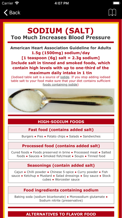 It's easy to consume too much sodium (in salt and sodium bicarbonate), and high consumption is linked to high blood pressure, heart attacks, and strokes. The American Heart Association (AHA) recommends an ideal limit of no more than 1500 mg sodium/day for most adults. Use the count and organiser tools to keep a daily record and bar chart of your sodium intake in mg and %RDA to lower your intake to meet the AHA's recommendation and in turn lower your blood pressure and improve your heart health. The interface is easy, quick, and intuitive to navigate, colour-coded, searchable, and zoomable using the pinch screen function. No internet connection, registration, personal details or additional payments required.