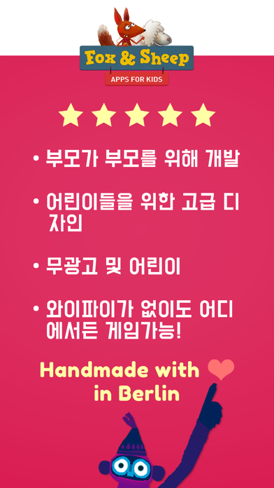 모자 원숭이는 어린이들에게 가장 좋은 새 친구가 될 사랑스러운 캐릭터입니다. Chris Haughton은 그림책 수상 경력을 갖춘 작가로서, 5세 이하 어린이를 위해 휴대기기 전용 „모자 원숭이"를 디자인했습니다. 이 꼬마 원숭이는 집 주위에서 매일 일어나는 일에 도움을 받아야 합니다. 책을 읽고, 전화로 이야기하고, 숨바꼭질이나 춤추기를 좋아하고 언제나 같이 놀아줄 친구를 갖고 싶어 하죠. Chris Haughton은 „Oh no, George“, „엄마를 잠깐 잃어버렸어요“, „Shh, we have a plan“ 등 500.000부 이상이 팔린 베스트셀러 책을 쓴 작가입니다. 어린이들이 모자 원숭이를 사랑하게 될 거예요. 우리 회사의 다른 어린이용 앱도 확인해주세요. ‘페팅 주(PETTING ZOO)’는 환상적인 iPad, iPhone 용 동화책 앱입니다. 이 앱의 특징은 20종이 넘는 동물들의 아름답고 재미있는 이야기와 대화 가능한 동영상입니다. 어린이들과 동물을 사랑하는 모든 분들에게 큰 재미를 줍니다. “잘자” – 는 사랑스럽운 동물들과 아름다운 음악, 멋진 이야기와 함께 매일 잠들 수 있도록 해주는 앱이다. “작은 여우의 음악 상자” 는 총 3곡이 내장되어 있으며 배경 그림의 캐릭터들을 터치하여100가지 이상의 움직임을 볼 수 있습니다. 그리고 작은 여우의 뮤직 스튜디오에서는 자신만의 노래를 만들 수 있습니다. 앱을 사용하면서 어떤 문제를 경험했거나 다른 의문점 있으면, 주저하지말고 언제든지 연락주세요. : [email protected] 고객에게 도움을 드리고 싶습니다. 고객의 기기 버전이나 iOS 버전을 알려주시기 바랍니다. „잘 자라 숲속의 동물들“은 우리의 자장가 이야기 시리즈 „잘 자라“와 잘 자라 서커스“의 최신 앱이며 우리의 잘 자라 앱을 통해 전 세계 800만명의 부모님들이 그들의 아이들을 잠재우고 있습니다. 세 번째 잘 자라 앱에서는 모든 이야기가 숲에 관한 것입니다.