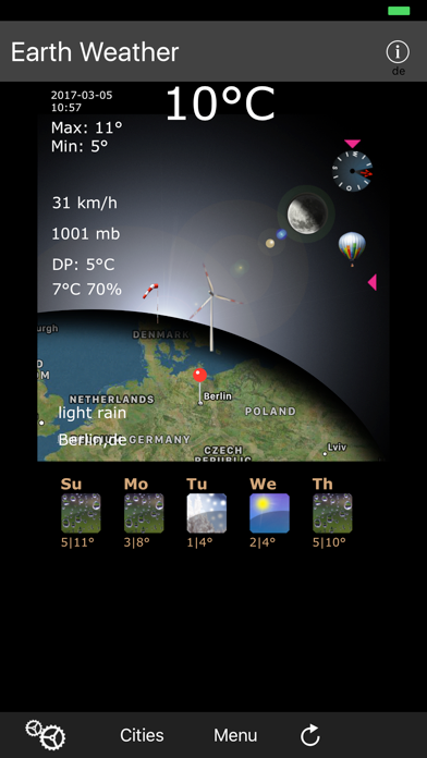Use your iPhone, iPod Touch or iPad as real Weather station. Big Temperature display, windchill temperature, humidity, wind speed, wind direction, barometer, moonphases and more values can hardly be desired. With this Earth Weather you can have fun with the weather. A 4-days weather forecast and more is built-in. Hint: In this Lite Version you can not edit and save own cities. Take the Pro Version. Displaying weather data: - Shows actual weather data - Shows the Station name resp. the town - Temperature in °C or °F - Windchill Temperature - Humidity in % - Wind force (+ Windcone/sock in 5 steps) - Compass displaying the wind direction - Air pressure (+ Balloon & animated Rotator) - Actual moonphases displaying - Date + time of the weather data - Simulation of 8 Weather sceneries, Windsock, Balloon (Air pressure) - Data: Internet, online (only a few Byte) - Map the actual location of the selected weather-station Settings: - 6 Cities with Test function - Temperature in °C or °F - Barometer in mb or hPa or Torr or psi or inHg - Wind speed in kph or mph or kn or meter per second More features: - Button for updating Data - Animation (fade in of Background, Windsock, Balloon, Compass) - Device do not turn off if run the App - 4-7 Day Preview, Trend and more - German Weather Podcast Videos (Video-Streaming) - more precise Weather - At snow: animated snowfall - deactivating the location service - View the Drewpoint temperature - moonphases - Wiki City (Informations of your city) - Ice Forecast (for your car windshield) - Positions of weatherstations calls on a world map - Barometer History (the last 6 values) - Not more use the location service, but enter your city in settings - Adapted for iPad, iPod, iPhone 4,5,6,7... - Universal App (work on iPhone, iPod and iPad)