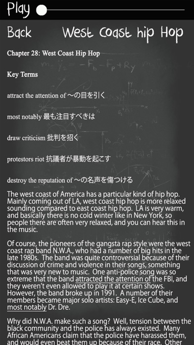 이 앱은 100년에 걸쳐 인기를 누리고 있는 34가지 서양 음악 장르에 대한 논의를 통해 언어를 가르치는 영어 교재입니다. 더욱 다양한 음악 장르를 배우고자하는 성인 음악 마니아들에게 이 앱을 강력 추천합니다. 또한 만 10-18세의 아이를 가진 부모님이라면 아이들이 풍부하고도 역사적이고 진정한 현대 음악사를 배울 수 있도록 선물용으로도 좋습니다. 25,000개 이상의 어휘로 이루어진 본문과 이를 읽어주는 음성 파일까지도 포함되어 있습니다. 170개의 유용한 영어 관용구 학습 또한 일어, 한국어, 중어로 제공하여 가르칩니다. 그뿐만 아니라, 음악 애호가가 손수 뽑은 500개의 노래를 추천하며 이 모든 노래 각각에 비디오 링크가 되어있고, 각각의 장르와 관련있는 여러 영화도 추천합니다.