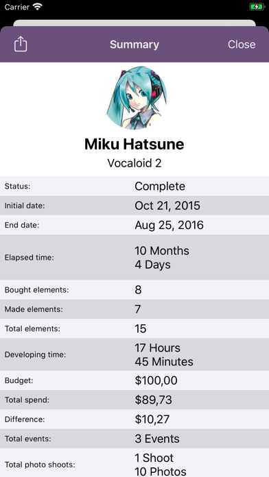 Create and manage all your cosplays with Cosplanner. You'll know the progress percentage of them in each moment, save reference images of the character, know the total cost and time you've invested in making each of its elements and the elapsed time of your project. When you finish it you'll be able to do even more! Log events where you will wear it, places, photo shoots, achievements and its best pictures! Do you know what has been your most expensive cosplay? Or the cheapest? What number of photos you have of them? Or which one has been worn in more events? Cosplanner will help you to track this info, so, you'll be able to decide what's the next cosplay to wear, or which of them is missing a good photo shoot Download Cosplanner now for free and try it on your iOS device *All characters shown in the screenshots are property of their respective authors, their use herein is for illustrative purposes only