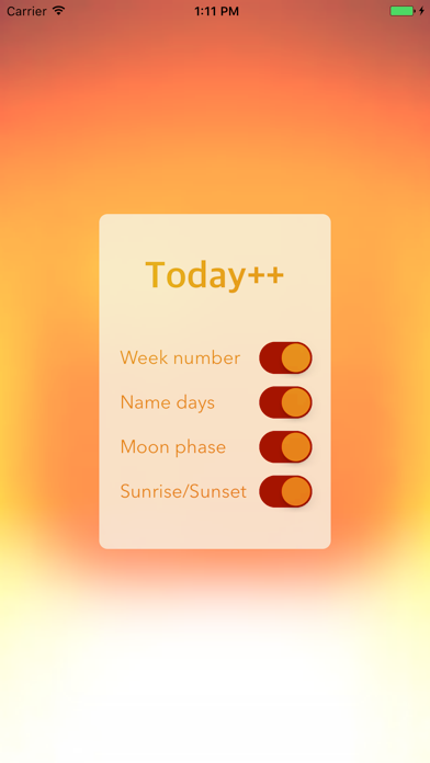 Today++ gives you week numbers, name days, moon phases, sunrise and sunset at the swipe of a finger! Utilising the advanced features of iOS 8, Today++ adds a widget to your Today view that can be displayed whenever you like by simply swiping your finger down from the top of the screen. Features • Week number • Name days for 20 countries (Austria, Bulgaria, Czech Republic, Estonia, Finland, France, Germany, Greece, Hungary, Ireland, Italy, Latvia, Lithuania, Poland, Slovakia, Spain, Sweden, Ukraine, United Kingdom, United States) • Moon phases • Sunrise & sunset for your current location