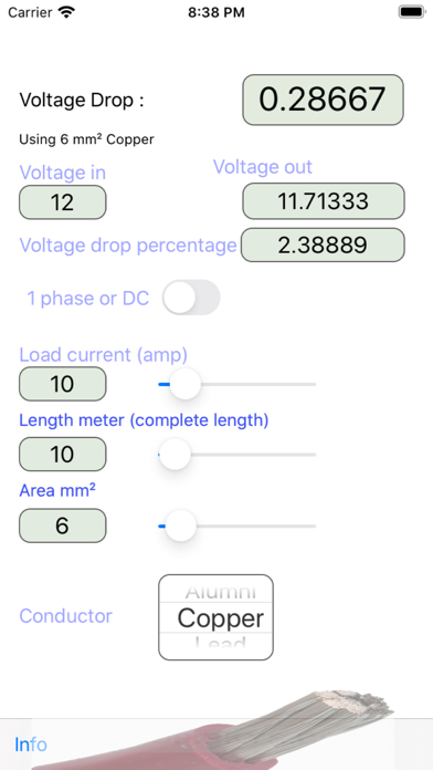 Voltage Drop calculates the voltage case in DC circuits. It contains many conductors as Silver, Cooper, Gold etc. The area mm2 can easy be changed to American Wire Gauge system. Meter or feet. Range feet/length/meter 1 to 300 Range Ampere 1 to 100 Range AMG 4/0 to 30 Range mm2 1 to 100