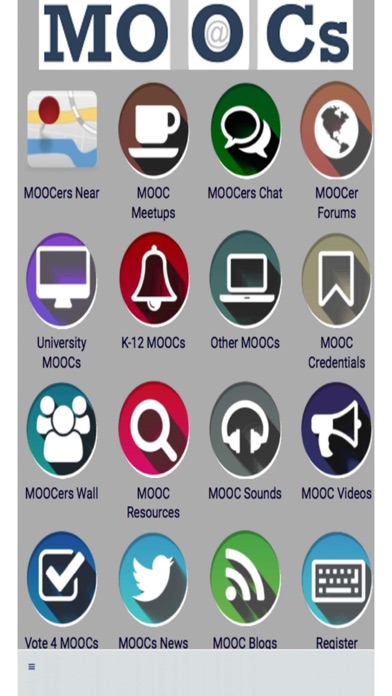 MOOCs University App is a Proximity-based Social and Educational Network App helping people interested in or already taking MOOCs to connect, help and learn from each other. Anyone Anywhere Interested in MOOCs from Any Platform or Provider can connect with others interested in MOOCs in their neighborhood, school, city, state, region, country, or countries of interest. App Features include, - MOOCers Near: Proximity-based feature to see & reach out to other MOOCers near you or around the world - MOOCers Chat: Live Chat feature enables you to talk live with other MOOCers around the world about MOOCs 24/7. - MOOCers Wall: MOOCers can post announcements to this wall seeking other MOOCers interested in same MOOC subject area;specific MOOC or just about anything related to MOOCs. - MOOC Meetups: List of MOOC Meetups worldwide. - Directories of Higher Ed, K-12, Verified MOOCs & Other MOOC Providers - MOOC Resources to help you in your MOOC Studies - Latest MOOCsNews & information