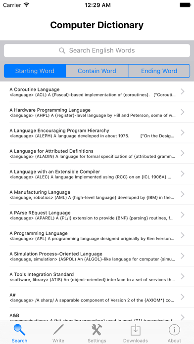 - 100% FREE Computer Dictionary with sound in English. - Computer Dictionary has 15,000 words with sound. - Offline voice in English. - Search the word and it will display its meaning and detail. - Listen the sounds of searching words and its meaning. - Type your own text and listen in English. - Select the English voice accent from USA (American), UK (British), Australia (Australian), South Africa (South African) and Ireland (Irish). - Select the English voice to listen offline and online in settings. - Set the voice speed to listen words slowly or fast in English. - Change the voice pitch of sound. - "Search Options" feature that help to search the word "Starting" with searching word or "Ending" with searching word or "Containing" the searching word.