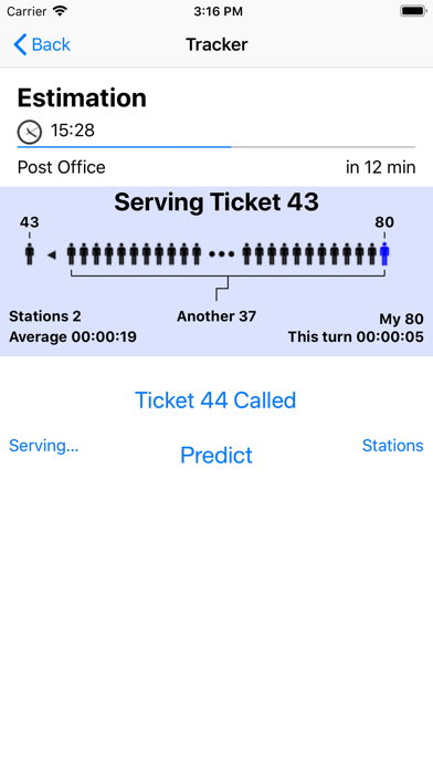 Queue Predictor lets you predict, when you are in a queue, when will be your turn. It is useful in many situations such as in a queue at the post office or similar places serving people using a progressive numeric ticket call. EFFECTIVE Queue Predictor allows you to go elsewhere with your ticket number and know when your turn is approaching, to be back in time for your turn (based on a statistical prediction) Queue Predictor automatically stores data about any place you stay in a queue and when you come back Queue Predictor has stats data about the place and is able to start predict your turn immediately as soon as you input your ticket number, the number currently served and the number of stations serving people. EASY TO USE Queue Predictor use a graphic display, showing the queue, to visualize your position and when will be your turn. When you are in a queue waiting for your turn that never comes, it is even fun to use, watching the graphical queue advance as the real one FEATURES • Track mode (to record times) and predict mode to predict queue flow when you are away from the queue • When you already used a queue it is able to predict your turn immediately (it remembers stats of the place) • Allows to keep data (average time) of different places • Can manage changing of number of stations serving • Can notify when is your turn also in background • Editable average time value for a place and weight of previous average in the stats • Shows graphically how your queue advances both in Track mode and in Predict mode • Works both on iPhone and iPad (on iPad both in Portrait and Landscape) • Optimized for iOS 12 requires iOS 9 minimum