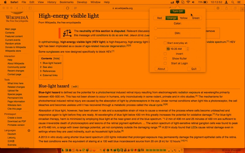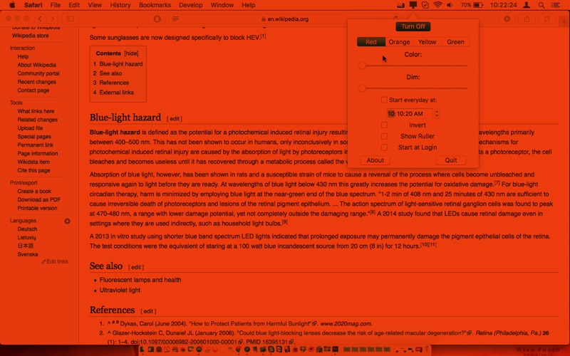DISCOUNT SALE From 5.99$ -> 3.99$ For limited time !!!! Screen Lights is created for those people who spend a lot of time working at night. Limit your exposure to energy-efficient lighting before bed. In addition to the LED screens in your electronics, energy-efficient lighting emits a lot of blue light. Exposure to blue light before you go to bed significantly affects your sleep quality, because it prevents your body from releasing melatonin, a chemical in your body that helps you sleep. Screen Lights will change the color of your screen, which will reduce the amount of blue light your screen emits, helping you sleep better, reduce eye strain and helps you focus on the most important things on the screen. Whether you're in a low-light environment or reading long documents, changing black text on a white background to white text on a black background can make a difference in your comfort level, provides better screen visibility in sunlight, without having to increase the screen brightness. It`s easier on the eyes for some people with a sensitivity to brightness, easier to distinguish for some people with color blindness, and easier to make out for some people with low vision. Show ruler to help you stay focused on the text you are reading. ***Just set the desired time and the application will automatically start for you, so you will not forget to start every time before you go to sleep.*** For those who use Screen Lights please leave us a feedback. ◆◆◆ Bug Fix & Feature Request ◆◆◆ If you have any problem, please email us at [email protected] / [email protected]. Thank you! We will fix bugs and add features for you as soon as possible. Screen Lights features: - Turn on/off screen light - Automatic turn on - Select between four colors - Control the amount of color filtering applied - Control dim level - Invert screen colors - Reading ruler - Start at login - No internet required - Friendly user interface - Easy to use and very useful