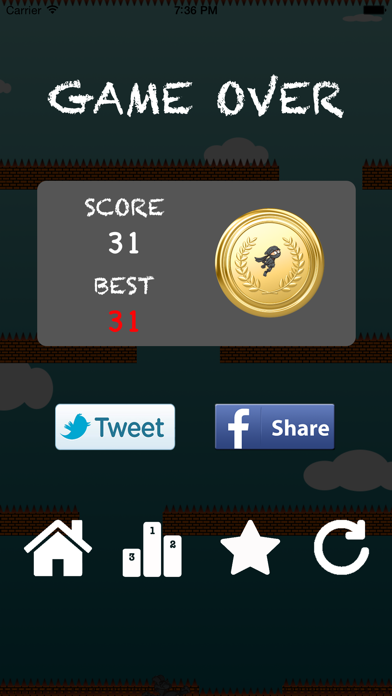 Tap to jump, it is not as easy as it looks. [HOW TO PLAY] – Tap left to jump left. – Tap right to jump right. – Avoid the bricks. – Your ninja will jump as far as how long you tap on the screen. – Try to get 3 medals: Bronze, Silver (hard), Gold (very hard). – The high score is the number on main screen, tap it for more details. – It's easy to play but hard to master. Enjoy the game. ©2015 D&D Studio