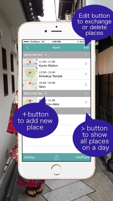 ◎ Useful for sightseeing or a business trip ◎ Also useful for a day trip ◎ The troublesome account making is unnecessary 1) Useful for sightseeing or a business trip You can list up places easily and then the maps around the destination are saved as pictures automatically. When registering a place beforehand, you can check the map offline. 2) Also useful for a day trip When you call a destination, search about the place or a route on Google Maps, this app help you. 3) The troublesome account making is unnecessary There is no worry of a personal information leak. If you download it, it can be used immediately. About a map view. * GoogleMap-base. * You can search for the destination by a key word. (For restriction by Google, a search result is narrowed down by maximum of 5.) * Long press on a map searches for places abound the point. * It takes a little time for reading on a map by the situation. When it's operated too much early, data can't be taken in, so please be careful. About a list view. * The exchange of the lines and deletion of a list can be performed from Edit button. * To Add and delete a day can be done. * A schedule can be output as a text or a picture. I'll upgrade this gradually now. Thank you for your download and opinion.