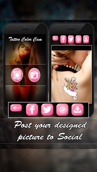 Tattoo Colors Cam "Tattoo Colors Cam" app lets you try new tattoo designs, without any pain! Tattoo yourself on your own photos. Using our app you will feel like in a virtual tattoo salon or photo booth machine. Just choose a pic from gallery or take one using camera, choose the tattoo design that fits to your style, rotate, resize, save and share your effect! "Tattoo Colors Cam" is the app where you can have gorgeous tattoos on your photos and you can change the color of the tattoos also. • Take your picture from camera and selecting tattoo from tattoos list and set it to on your photos. • Adjust the zoom and scale, rotate and place the tattoo anywhere for perfect placement. • View your tattoo designs album. • Post your designed picture to Face book, twitter, E-mail and show everyone your new tattoo. This app help you to have beautiful tattoos without any physical pains to your body. No one will know that it’s not real so, share your tattoos to your friends and get a favor feedback. Enjoy the app.