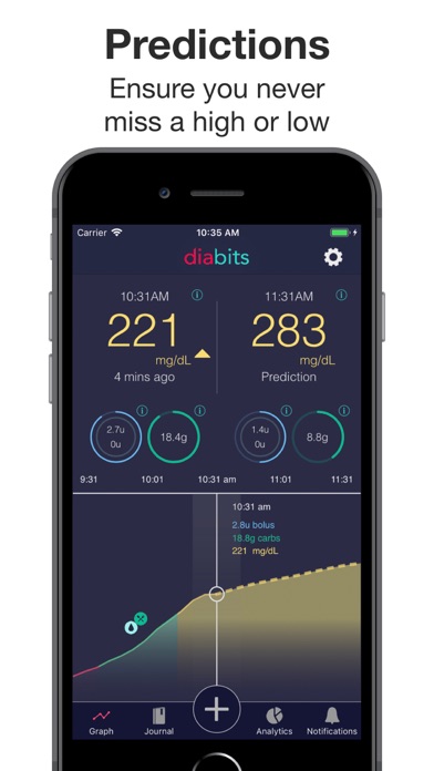 Worry less about your blood sugar! The Diabits app is a personalized diabetes management tool made by Bio Conscious for people with type I and type II diabetes. Using a machine learning algorithm, the Diabits app builds a personalized model of your blood sugar. The model gives you estimates of your blood sugar up to 60 minutes ahead of time to help you better understand how different stimulus impact your blood sugar trends, and how to better avoid highs and lows. Take advantage of the most accurate and most sophisticated insights available for diabetes management. The Diabits app is the perfect companion app for users of Dexcom continuous glucose monitors (CGMs), or Nightscout. Use the Diabits app to: 1) See your future glucose fluctuations 60 minutes ahead of time. 2) Stay informed throughout the day to avoid highs and lows. 3) Keep your loved ones in the loop by allowing them to see your blood sugar data and notifications. Other features: Follower check-in Journaling Analytics and insights Critical alerts Apple health integration Requires: Dexcom G4 (with Share), Dexcom G5, Dexcom G6 or Nightscout For greater personalization of your blood sugar estimates, connect Fitbit or Apple Watch. Stay up to date: www.diabits.com This application is not owned by, or affiliated with Dexcom. The Diabits app ("the app") is designed to demonstrate the potential value of estimating blood sugar in order to assist with diabetes management. The estimates of blood sugar in the Diabits app should only be considered in direct conjunction with the data from your continuous glucose monitor ("CGM"). Always refer to the measurement made by your CGM before making any corrections with food, insulin, or otherwise. Do not use the Diabits app to determine insulin dose, or to control an insulin pump or other sort of insulin delivery system. The Diabits app is not intended to replace any self-monitoring practices, or other treatment methods prescribed by your primary care provider. The data displayed in the Diabits app, including the blood sugar estimates, the measured value, or any other details about your blood sugar trends should not be taken as fact. Only your CGM itself may be considered a fully accurate source from which to view or receive data from your CGM. The estimates in the Diabits app are made by a machine learning algorithm and may or may not be representative of your actual blood sugar in the future. The machine learning model which powers the Diabits app takes between three and seven days to learn your personal physiology, and will become more accurate with continued use. The Diabits app, by default, sets the low boundary of your target range at 70 mg/dL or 3.9 mmol/L. The high boundary is set at 180 mg/dL or 10 mmol/L. You may change these values at any time, and should set your target range boundaries based on the recommendation of your primary care provider. Please review our privacy policy: https://www.bioconscious.tech/privacy and Terms of Service: https://www.bioconscious.tech/diabits-terms if you have any further questions.