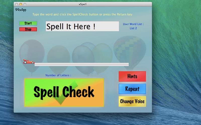 xSpell is designed to help early graders learn to spell, especially for the next test ! Up to 30 words lists of up to 24 words can be entered by you. In addition, there are several "standard" curriculum spelling word lists available for Grades 1 - 3, and some "fun" lists. xSpell is very easy to use, but is thorough. The computer speaks the word and the student types it in. If the word is spelled correctly, xSpell advances to the next word after a congratulatory comment. If the word is missed, the student is asked to try again. After two misses the "Hints" feature is activated to guide the student towards the correct spelling. Hints allow the student to learn hard words. After the lesson is completed there is a review session to go back over any words that were missed or received hints. The review is repeated as long as necessary for the student to correctly spell all of the words. You can select any of the available voices on your computer for the teacher. You can also pick out a subset of these voices for the student to easily cycle through with the "Change Voice" button. This helps a lot with intelligibility on some words. xSpell was originally developed a few years ago for my grandkids. Yes, they did well on their spelling tests. The app is easy to use, effective, and cheap - it's a xApp !