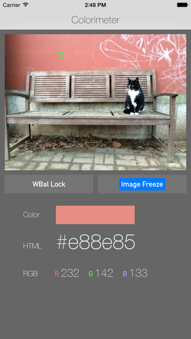 Colorimeter is your professional color picker. Just point your iPhone camera to an object and tap in the video image. Colorimeter displays the selected color in HTML hex code and RGB components. Colorimeter is low light compatible: Antialising rendering deletes any noise in the video image. By touching the "WBal Lock" button you can lock the white balance to get unmanipulated real world colors.