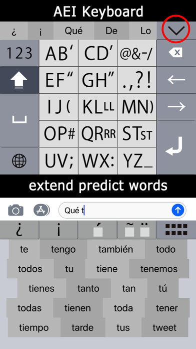 For iPhone User please try "AEI Keyboard Note" App. (This app is Free) What is Good about AEI Keyboard - Only One Push to input Vowel (letter). - Less than Two Push to input Alphabet. (any letter) - Input faster with Two Thumbs. Original Spanish Keyboard for iPhone & iPad * With Arrow Keys * Word predict. * Easy to input “¿¡áéíóúüñÁÉÍÓÚÜÑ" * iPad Special Ten Keys like PC Ten Keys. * Ideal Key for iPhone (It's called AEI Keyboard) Useful keyboard Settings (tap"tools") You can turn off Key Sound from it. Please add this Keyboard from iOS Setting and switch "Allow Full Access" Note : This app may not work on Old Apps.