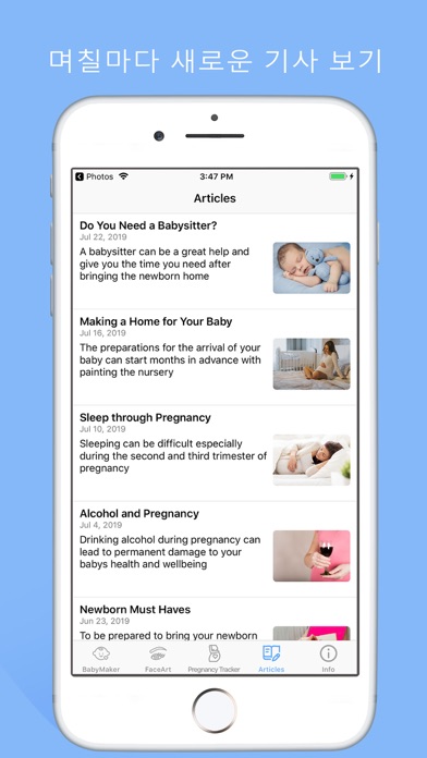 좋아하는 사람이 있나요? 커플이라면 아기의 모습이 어떠할지 보고 싶으신가요? 2명의 사진을 촬영하면 9개월이 아니라 9초 만에 아기가 미소짓는 모습을 볼 수 있습니다! 아기를 가질 예정이신가요? 아기의 성장과 신체 변화를 추적하고 임신 기간의 주 단위 건강 팁을 받으세요. 며칠마다 최고의 전문가들이 게시하는 임신에 관한 유용한 정보를 얻으세요. BabyMaker는 Luxand 생체 인식 기술을 기반으로 복잡한 과학을 적용하여 즐거운 시간을 제공합니다. 두 얼굴을 혼합하는 대신, 이 혁신적인 기술은 두 가지 소스 사진에서 얼굴의 특징을 파악하고 그 수학적 표현을 생성하고 강력한 계산을 적용하여 두 "부모"의 어린 얼굴을 닮은 새로운 얼굴을 표현하는 모델을 만듭니다. BabyMaker는 그 수학적 모델을 기반으로 새로운 얼굴을 렌더링하고 두 사람과 아기를 보여주는 완벽한 사진 콜라주를 만듭니다. BabyMaker contains $7.99/week with 3-day free trial period and $49.99/year. The price is for the United States customers; pricing in other countries may vary and actual charges may be converted to your local currency depending on the country of residence. Payment will be charged to your iTunes account at confirmation of purchase. Subscription automatically renews unless auto-renew is turned off at least 24-hours before the end of the current period. Account will be charged for renewal within 24-hours prior to the end of the current period, and identify the cost of the renewal. Subscriptions may be managed by the user and auto-renewal may be turned off by going to the user's account settings after purchase. Any unused portion of a free trial will be forfeited if you purchase a subscription. Privacy Policy: https://www.luxand.com/privacy.php Terms of use: https://www.luxand.com/termsofuse.php