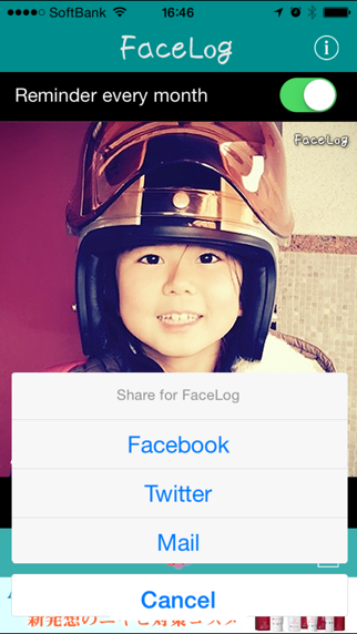 Do you have that face I saw a movie that will change? From baby until adult, also let's continue to regularly captured by the camera changes daily. Eye position is also looks naturally and to flip the video because the same. (Video processing please use the dedicated software.) Since date is distributed to FaceLog dedicated album folder entered automatically, you can enjoy a change of face by simply flick. Because they are converted save size on the size of 640x640 I will continue to take without worry about the capacity of the iPhone. You do not forget to shoot every month in reminder function. Let's start from today the fixed-point observation of face!
