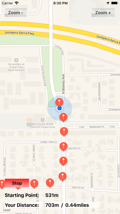 GPS distance tracker for running, walking, hiking, or cycling. This app will map and show your trail as you jog, hike, bike, or walk. It shows the real time distance that you have traveled in both meters and miles, and shows your path on the map in case you want to backtrack. You just tap "Start" to begin tracking your path, and you can either leave the map open to view your current location real time, or press the home key to have the app continue tracking your progress in the background. It also shows the distance from your starting point in a straight line versus how far you have traveled on your path. The following comment is required for applications that can also run in background mode if you continually leave running: "Continued use of GPS running in the background can dramatically decrease battery life."