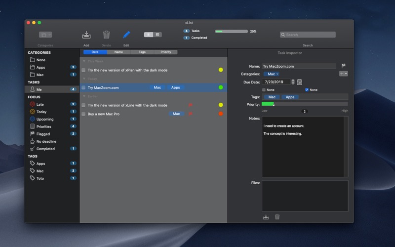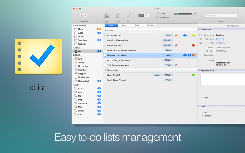 xList gives you everything you need to create tasks, schedule tasks, and track progress. Inspired by GTD method (Getting Things Done). Know what you need to get done each day by prioritizing your tasks list and increasing your concentration with Focus section, Categories and Tags. You can also attach documents to tasks. Everything is saved in realtime inside a database. No needs to create a document. For more information about the features or to download a trial version, visit our website.