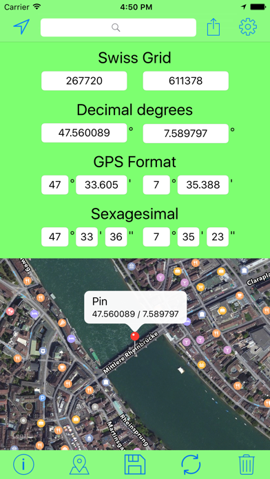 Swiss Grid Coordinates Tool is a great tool to convert your coordinates into different formats. You can convert your coordinates into 4 formats: - Swiss Grid - Decimal degrees (DDD.DDDDDD°) - GPS Format (DDD° MM.MMM′) - Sexagesimal (DDD° MM′ SS″) Extra functions: - You can locate yourself and convert these coordinates. - You can set a pin or move a pin and it shows you the coordinates of the pin. - You can see the distance between you and the coordinates or between you and the pin. - You can search for locations. - You can share and send your coordinates. - You can display the coordinates (or your location) on the maps app. - You can save and load coordinates to use them later. - You can hide the map to save battery and mobile data.